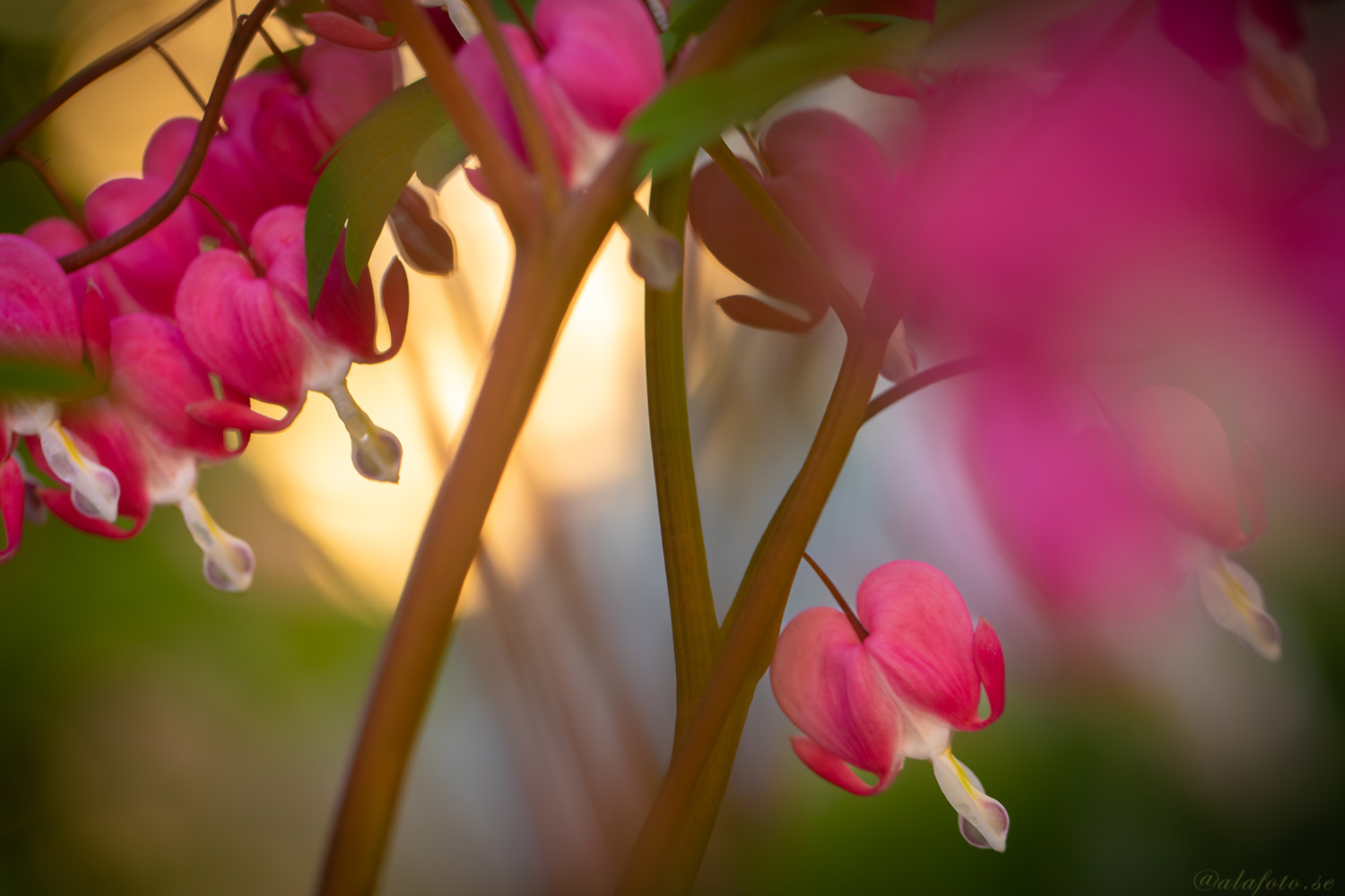 Föreställ dig en stillsam sommarkväll, solen är på väg ner och sprider sitt gyllene sken. Den lågt stående solen lyser bakifrån och i genom de vackra små blommorna och skapar en nästan magisk glöd runt varje litet hjärta. Det ger ett drömskt och mjukt uttryck som verkligen lyfter fram blommans skönhet.