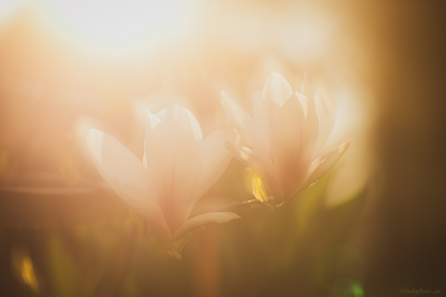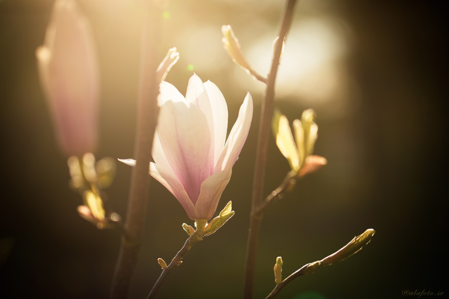 Magnolia är magiska träd med underbara blommor. De finns i olika färger från vit till rosa och gult. Jag har tänkt hela våren att jag ska fotografera Magnolia och i parken i stan vet jag att det finns flera stycken Magnolior men de flesta, om inte alla, är vita och det var jag inte så sugen på. Jag ville ha ett sånt där stort rosa magnoliaträd som var överfull med blommor. Jag kom aldrig dit för jag har inte haft någon ork. Har mått lite dåligt och dessutom börjat jobba och det har tagit mycket krafter och tid så det har inte blivit av. Men en av mina grannar har planterat ett magnoliaträd i vår trädgård och även ifall det inte var många blommor så fanns i alla fall två bredvid varandra och det funkade till den bild jag ville ha. Dessutom är det den där magiska färgen som är rosa i mitten och vit utåt. När det får växa till sig kommer det också bli magiskt!