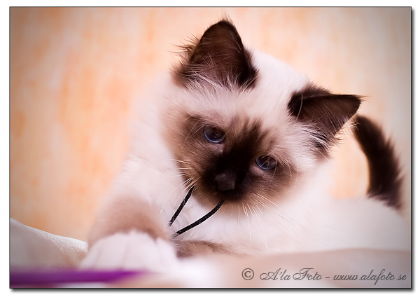 Det var längesen jag visade en bild på min rara galning så här kommer hon! Hon gör hyss hela tiden och är där hon inte får vara! Hon käkar på mina blixtparaplyer, har till och med försökt klättra på dem, hon ligger på min router och pajar hela mitt internet! Där får hon verkligen inte vara så jag tar bort henne och kastar henne i sängen och hon tillbaka och så håller vi på ett antal gånger tills hon inser att jag är envisat och då hoppar hon på mina fötter och biter mig!! :O)) Så till slut tar jag upp henne i min famn, leker med hennes svans så hon börjar bita i den och mitt i de värsta betten somnar hon!! Min underbara knäppis! :O))